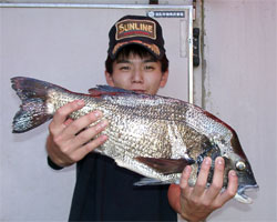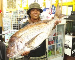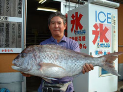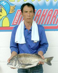 8月6日、つれた会の藤本さん、鶴見大島の波止で、53cmのチヌを見事仕留めた。 |