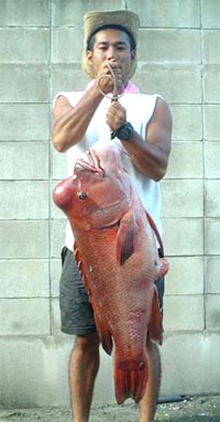 8月3日、厳原町の坂本さんは、87cm 12.5kgの大型カンダイを仕留めた。 |