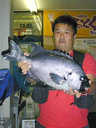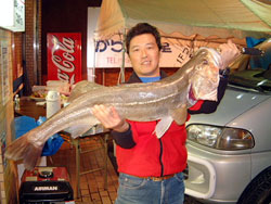 薩摩川内市の児玉さんは、「シーバスパーティーIN鹿児島2006」に参加し、 見事に98cm 7.08kgのマルスズキを釣り上げ優勝しました。 |