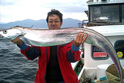 11月12日、錦江湾の山川沖でアジの泳がせ釣りをした木下さんは体高25cm、全長約170cmの巨大キビレタチウオを仕留めた!