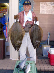 11月21日、地島の福寿丸で船釣りに行った西原さんは、アジゴの泳がせ釣りで大型2匹を含むヒラメを6匹とヒラマサ、サワラを釣り上げた。