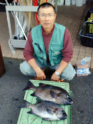 5月8日、宗像沖ノ島のコンクリ裏にイシダイ狙いで上礁した谷口さんは、56cm 3kgの大型を頭に2匹の本命を釣り上げた。