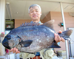 6月21日、立山さんは、南郷水島1瀬にて午前8時にオナガメジナ3kgをハリス5号、餌沖アミボイルにてお見事ゲット!