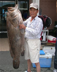 8月21日、宗像大島の第二宝栄丸で大島沖に釣行した田中さんは、イカの泳がせ釣りで42kg136cmのアラを釣り上げた。 同じく松岡さんは、38kg134cmのアラを見事にGET! |