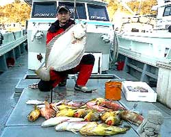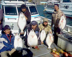3月8日、お客さんは、ヒラメ、根魚ねらいで今年、一番特大ヒラメ9kgオーバー、アオナ、アラカブなども釣り上げた。 |