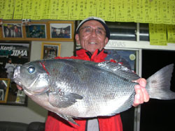 3月9日、今年始め竹島にて70cm口白石鯛捕獲の竹永さん(大分)も見事な60cmオ-バ-尾長めじな2枚もゲット! |