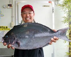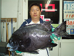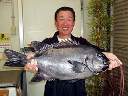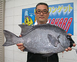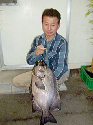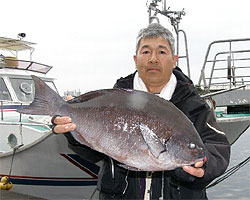 3月9日、男女群島に釣行した周遊会の中嶋さんは、56cmの見事なオナガグレを釣り上げた。 |