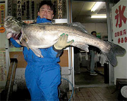 3月16日、久田さんはルアーで119cm 14kgの超大型スズキをゲット。重すぎて タモアミが壊れたそうです。 |