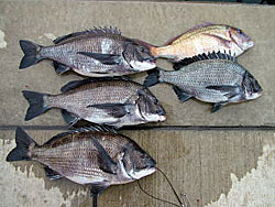 3月9日、有田さんと猪熊さんは地磯からチヌ52cmを筆頭に同型を4匹とマダイを1匹の釣果!! |