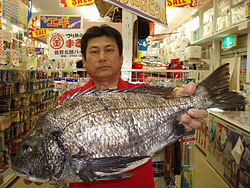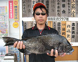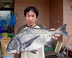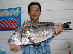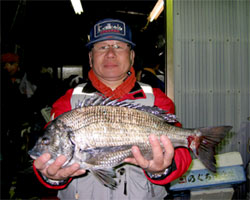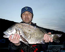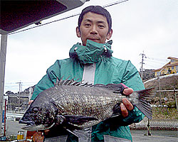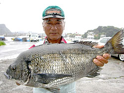 4月5日、大島の磯で常連の井上さんは53p、2.5sの良型チヌをゲット!! |