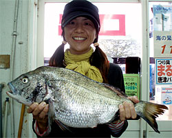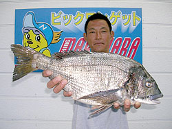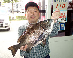 4月1日、厳原町の小宮さんは浅芽湾にて52.5cm 2.3kgのチヌを釣り上げました。おめでとうございます! |
