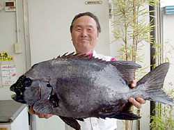 4月12日、袰谷(イヤタニ)さんは、佐多岬にて14時半頃、良型イシダイ65cm5kgをガンガゼ餌にてお見事ゲット! |