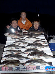 4月7日、吉田さん、福田さん、渕野さんは、阿値賀島にてチヌ最大54cm2.42kg、スズキ最大78cm3.5kgをゲット! |