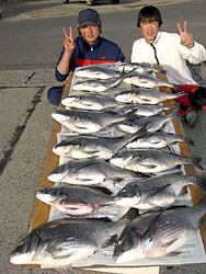 4月6日、博多友グレ会の前田さんと松本さんは、チヌ最大2.7kg〜1.6kg計24匹、朝6:00〜15:00までの釣果。まだ釣れていたが15:00に納竿。 |