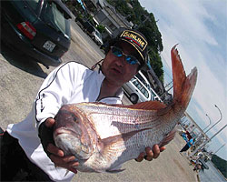 7月2日、松本さんは、西浜の磯にてマダイ85cm7.7kgを釣り上げました。 |