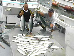 9月21日、お客さんは、イワシ落としでカンバチ3kgを3匹、タイ2〜4kgを2匹、ヒラマサ5kg、マグロ5kgを2匹、ブリ5匹、ヤズ10匹、ヨコワ10匹釣り上げた。 |