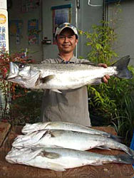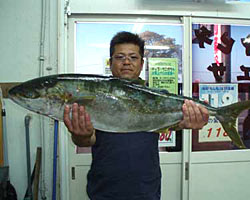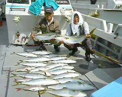 10月2日、お客さんは、イワシ落としで悪天候のなかヒラマサ3〜5kgを6匹、3kgブリ13匹、サワラ4匹、ヨコワ15匹、タイ2匹釣り上げた。