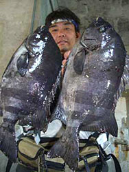 10月19日、飯干さんは大淀川河口でのルア−釣りにて午前0時から1時の時間の間に集中してスズキ75cm4.16kgを頭に良型4匹!お見事ゲット!その他3kg弱クラスのスズキ3匹もリリ−スの大漁でした。 |