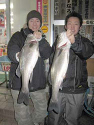 1月28日、峰松さん・山口さんは、ルアー釣りでスズキ65cm2.2kg・64.5cm2kgを仕留めました。