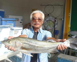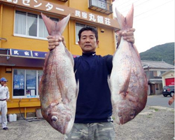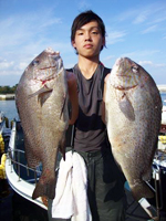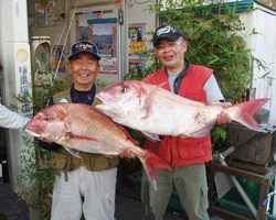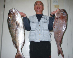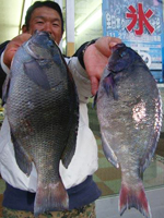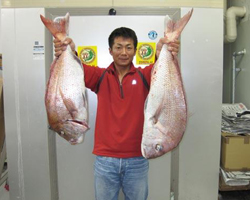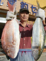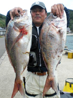 10月4日、籐さんと中村さんは、マダイ最大65.7cm3.05kg、スズキ最大80cm3.8kgをGETしました。 |