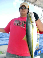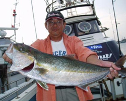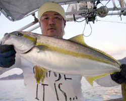 10月4日、西嶋さんは、ヒラマサ4.5kgをゲット。水深20mでジギング。ほかキャスティングで8.5kgも上がったそう。 |