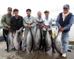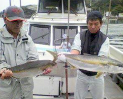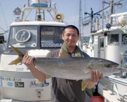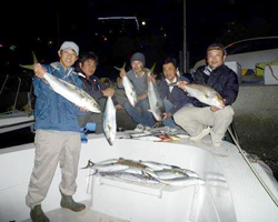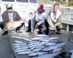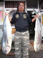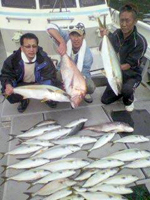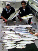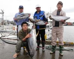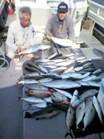 10月3日、金本さんはカンパチをゲットし、砂塚さんグループはサワラやヤズ、矢野さんはヒラマサ、河野さんグループはタカバやヤズ、イサキなどをゲット |
