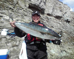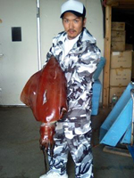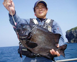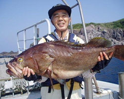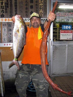 10月29日、松岡さん(山口県)は、竹島オンボで午前5時ごろ、イシダイ竿使用の投げ込み仕掛けでソーダカツオ切り身でお見事、アラ12kgゲット!真夜中の0時にはピトンを曲げて壊し、竿は岩場に張り付く強烈な締め込みに逢う!取りあえず立派なアラのお土産が出来上機嫌で山口までお帰りなさいました。 |