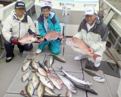 10月2日、お客さんは、悪天候のなかタイ4kg〜2kgを5匹、ネリゴ15匹、サワラ3匹、ブリ1匹、昼までで釣り上げました |
