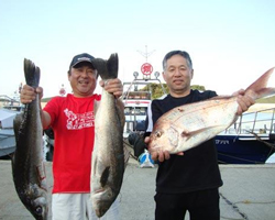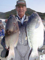 10月25日、佐藤さんは中五島にてマダイ60cm〜65cm、深町さんはクロをGET! |