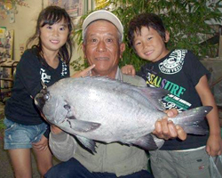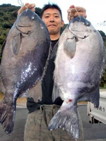 10月29日、島里さんと堂込さん(鹿児島)は、竹島モリヤマにて午前7時半と10時にガンガゼ餌にて良型イシガキダイを仲良くゲット!他のイシダイ情報は、クズ瀬ハナレでイシガキダイ3匹、コオリヤマで1匹と朝1番大当たりあるも無念のバラシ!船釣りの木谷さん(熊本県)は、シマアジ・カンパチ・クロヒラアジ・シブなどク-ラ-満タンでした。同じく船釣りの永福さん(鹿児島)もフエフキダイを頭にク-ラー満タンの釣果でした。 |