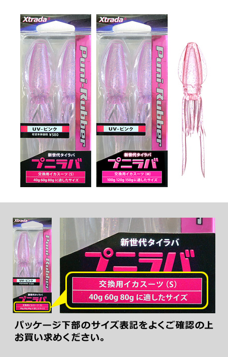 プニラバに共通で使えるイカ型スーツです。Sサイズは40g・60g・80gに、Mサイズは100g・120g・150gに適合します。プニラバに付属している内蔵オモリに着せ替えてご使用ください。1パック2匹入りのため、交換予備用としてもご使用可能です。オモリカラーの組み合わせ次第でオリジナルプニラバができます。全7色。