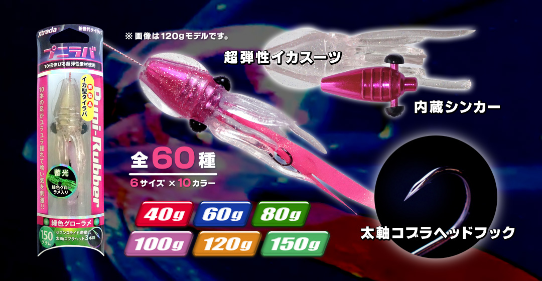 ロックフィッシュ大爆釣のプニイカとシンプル操作でよく釣れるタイラバが融合! マダイの大好物であるイカ型シルエットと10倍伸びる超弾性素材から発生するナチュラルな波動が相乗効果を生み、低活性時でも喰わせる! マダイはもちろん、アコラバとしてロックフィッシュにも圧倒的な釣果があります。