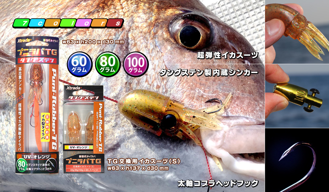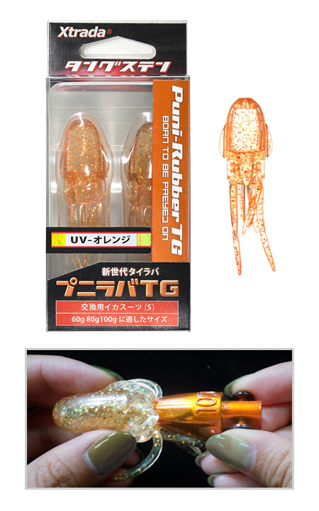 プニラバTG 60g・80g・100gに共通で使えるイカ型スーツです。エソやフグに襲われて傷んだとき、内蔵オモリに着せ替えてご使用ください。オモリカラーとの組み合わせ次第でオリジナルプニラバTGができます。全7色。
