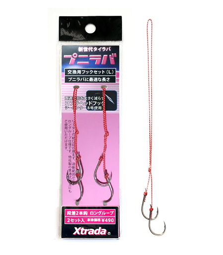 プニラバシリーズに共通で使える太軸コブラヘッドフック段付き2本鈎です。ガリスシーハンター8号を使用したロングループ仕様2セット入り。スライド巾が大きくてリーダーの結び目が傷まないので、他社製の貫通鯛玉にもご使用いただけます。