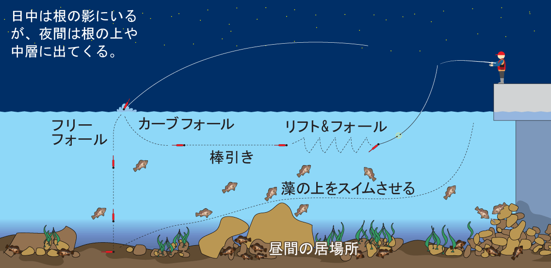 潮位が高いときには岸近くまで寄っているので釣りやすいが、干潮だからといってあきらめる必要はない。その分、密度が増しているので、水深があって潮があたる干潮向きのポイントを探せばいい。本命ポイントを正確に攻めるにはケミホタルが役に立ってくれる。ワームの位置がわかるのはもちろん、集魚効果も見逃してはいけない。暗い場所では黒チューブを使うのが上級テクニックである。