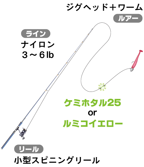 1~1.5グラムの軽いジグを、ティップに乗せて飛ばせる柔軟なロッドが必要です。バス用では硬すぎて魚をはじくことが多くなりますが、管理釣場用トラウトタックルのL(ライト)かUL(ウルトラライト)なら流用できます。専用ロッドはファストテーパーに作られているため振り抜け性もよく、遠くまで飛ばすことができます。またバット部分も丈夫なので外道のスズキとやりとりすることも可能です。
