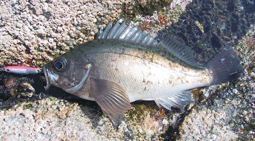 ブルーバックは西日本に分布する回遊性の青メバルです。体全体が白っぽく、外洋の表層を泳ぐため、背中がサバのように青くなっています。小魚をバシャバシャと追い回し、性格が乱暴なので、このメバルが回遊してくると地付きの青メバルも赤メバルも底に隠れてしまって姿を見せません。平均身長は18~26cmですが、ヒット時の引きは極めてパワフル。青物の50cmクラスに匹敵します。