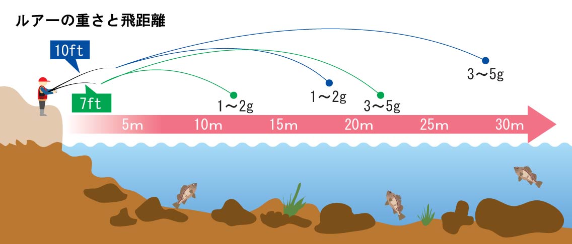 軽いルアーを遠投するには軟らかいロッドが適していますが、あまり軟らかすぎるとアワセのタイミングが遅れたり、大物のつっこみに耐えられないといった問題も起こります。ロッドは長いほうが遠投性が高くなりますから、ポイントが遠い場合には長めのロッドを使います。堤防からの場合は取り回しのいい6~7ftを、開けた磯では足元の岩をかわせる10ft前後を使ってください。