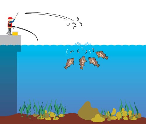 エビ撒き釣りは、海底で寝ているはずのメバルを浮き上がらせて釣る方法です。どんなエサでも昼よりは夜の方がよく釣れますが、昼釣りで使うなら生きエビが一番のエサです。好物のブツエビを少量ずつ撒くことで競わせ、活性化して浮いたメバルを浅いタナで釣るために100匹超えといった数釣りが見込めます。