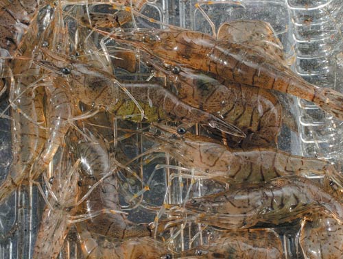 淡水産スジエビの一種で、流通が安定しているのでブツエビよりも安価。大きくて鈎につけやすく、色が白いために目立ちやすい。付け餌での使用がメイン。水平に泳ぐ性質があり、自ら望んで底に行く気はないので、撒き餌にするときは数匹づつ軽く手で握って気絶させて沈めるか、底撒きカゴを使って海底まで届ける。