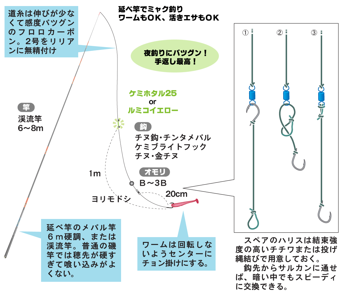 暗い場所では万事に目が行き届かないため、シンプルな道具立てが必要になります。延べ竿なら外灯のない場所でもトラブルとは無縁。7m級の竿を使えば13mは届きますから、カバーできる距離もメバリングと遜色ありません。