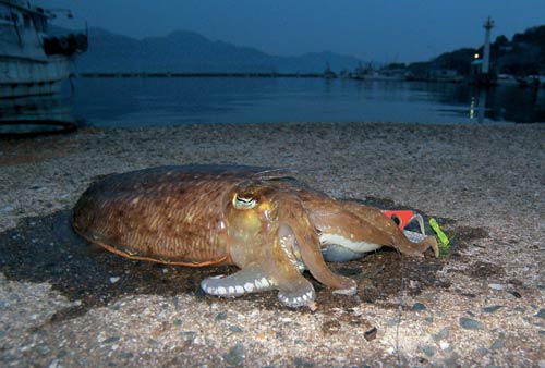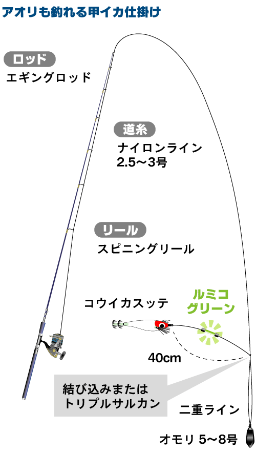 砂地に潜る習性があり、泳ぎ回ることが少ない甲イカはズル引きが基本になります。足が短くて力が強いため、エギでもスッテでも、深く刺さって身切れしない大鈎を選んでください。船からは胴突きで、岸壁や堤防からはダウンショットリグで釣ります。5~8号程度のナス型オモリをつけて遠投したら、あとはシャコかエビをイメージしながらゆっくりとズル引いてください。シャクリはごく少なくて大丈夫です。この同じ仕掛けでアオリイカも釣ることができます。甲イカはアオリイカ以上に ケミホタル に反応するので、エギの頭に ルミコ を付けて誘うと釣果が増えます。