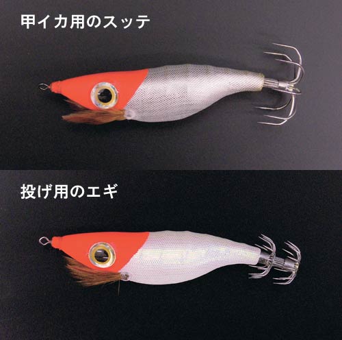 甲イカ用のスッテは、投げ用のエギとは違って、フックが大きく水中でサスペンドするのが特徴。