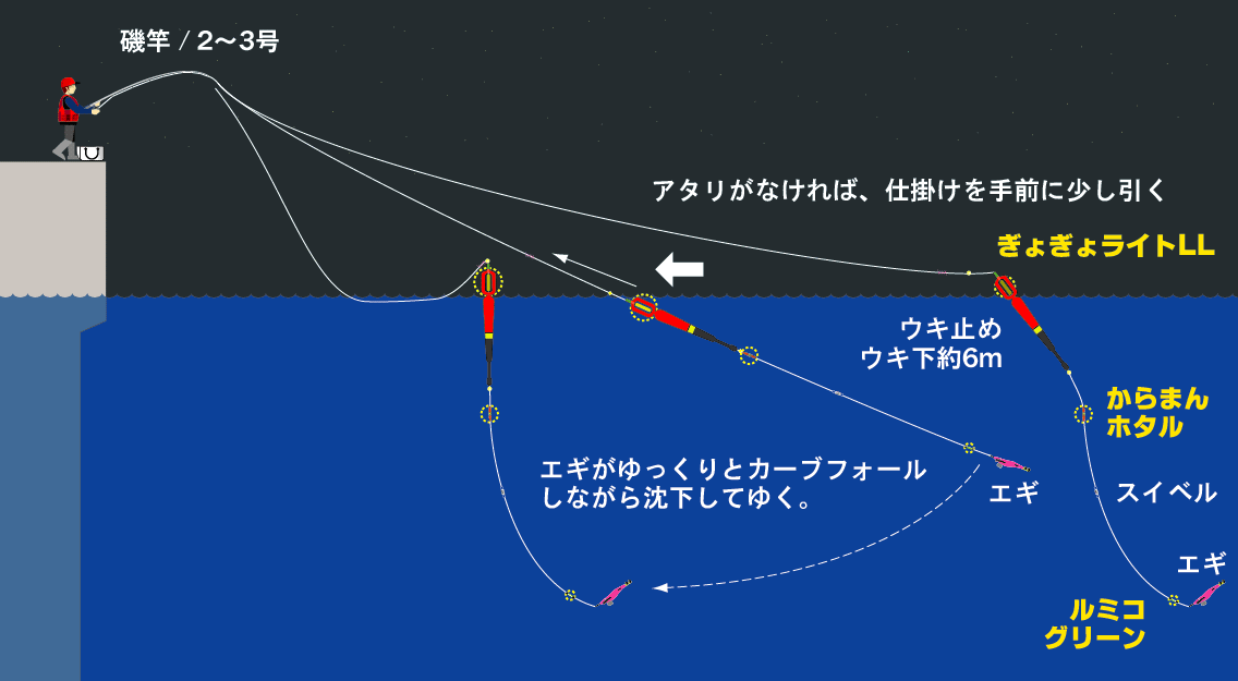 仕掛けを作る場合は、まず先に使うエギを決めて、風呂場でウキとのバランスを取っておきます。現場ではシャクって流し、シャクって流せば一人勝ち状態。風のある日、潮の速い場所、ライバルの多い釣場でお試しください。