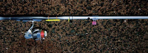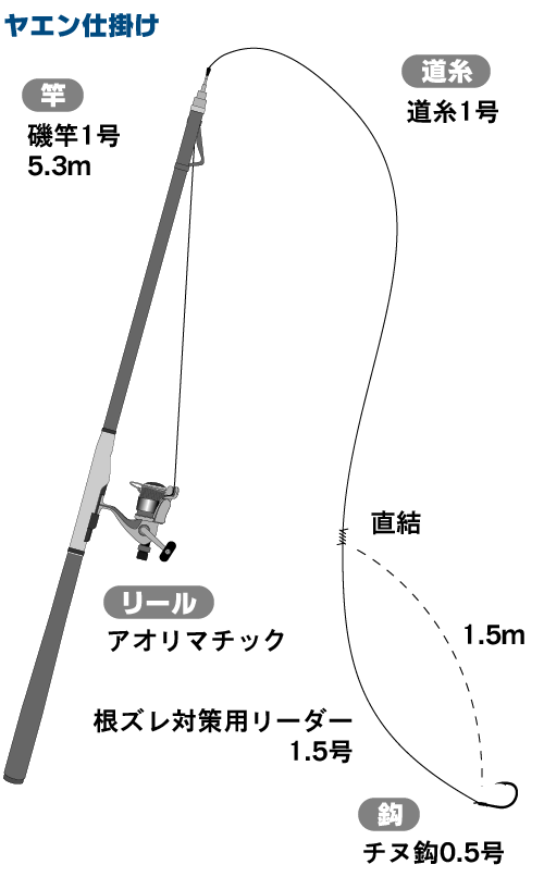 イカを驚かさず、竿の弾力を利用してヤエンを喰い込ませるには、軟らかい竿が向いています。ヤエンを入れるときに、竿を後ろに倒してラインを掴みますが、このときに外ガイド竿だと糸絡みが起こりやすいので、できれば1~1.5号の中通し竿( 磯用 )を用意してください。堤防やテトラなら5.3m、イカダやカセなら4.5~3.6mの短いロッドを使います。竿が長ければ張り出した根をかわしやすく、角度が付くためヤエンも入れやすくなります。逆に短ければ、取り回しが便利でイカとのやり取りも楽になります。