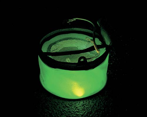 20リットル程度の活きエサ入れが必要です。ルミカライト6インチ( 黄色 )を入れておけば、アジが壁にぶつからず長持ちし、暗い場所でフタを開けたときのビックリ飛び出しも防げます。エアポンプ用ポケット付きでフタのできる丸形、海中でも生かせる網付きタイプが便利です。予備の電池とアジを取り出すネットもお忘れなく。