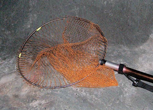 枠の直径50~60cmクラス。網は目立たない透明がお勧めですが、目があまり細かいとヤエンが引っかかるので注意してください。枠に ケミホタル を2本、テープで巻いておくと、暗い場所でも網の位置と向き、枠の中に入ったことが判って重宝します。釣ったイカを生かしておく場合はフロート付きのスカリも用意してください。取り込む前に海面で墨を吐かせるのがコツです。