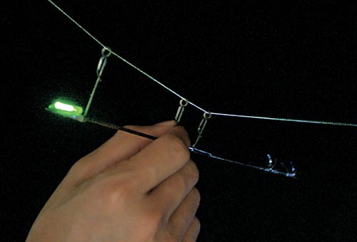 ラインを緩め、竿を後ろに倒して道糸を掴む。追跡用の ケミホタル25 を装着したヤエンを口にくわえて準備完了。