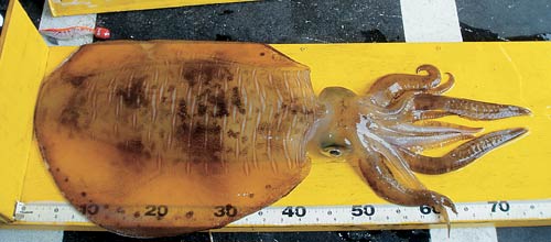 逆噴射をしのいで、がっちり鈎掛かりしたら取り込み開始。タモに ケミホタル を取り付けておくと、暗い海中でもタモ入れは万全だ。大型のイカほど海中で墨を吐く。下流にいるイカは警戒するので、墨の流れる方向に注意すること。