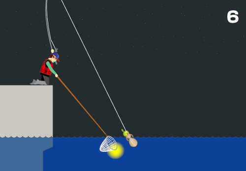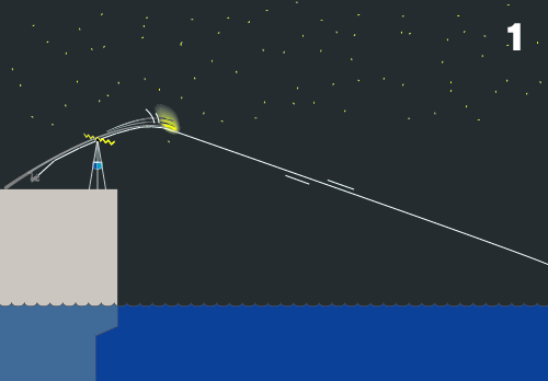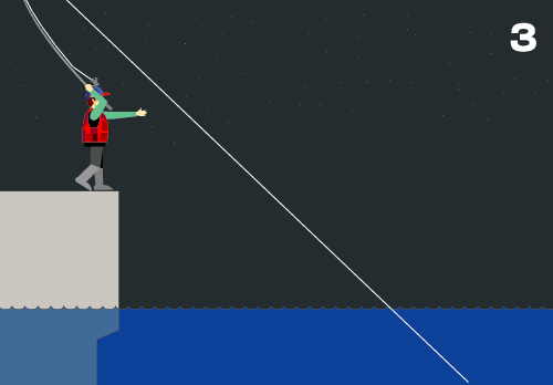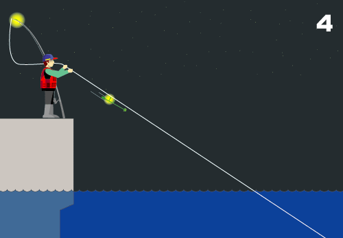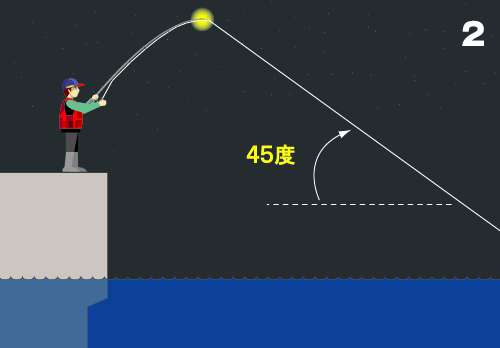 イカが10~20mまで近づいて、ラインが45度くらい( 高い堤防からの場合は60~80度 )になればヤエンを投入できます。あまり遠くからだと、竿を一杯に立てても角度が緩くて届かないし、50mもあれば5分以上かかるのでタイミングを逃します。時間がきたらヤエンを口にくわえて竿を起こし、ラインを掴んでください。竿を脇に挟んでラインにヤエンをセットしたら即座に発射。空中を滑らせて水中に入るまでは左手のラインを動かさないこと。着水したらヤエンが安定するので竿を手にしても大丈夫です。